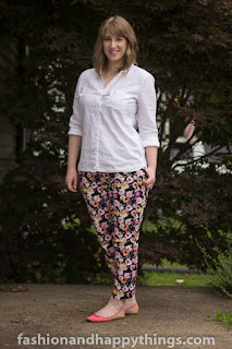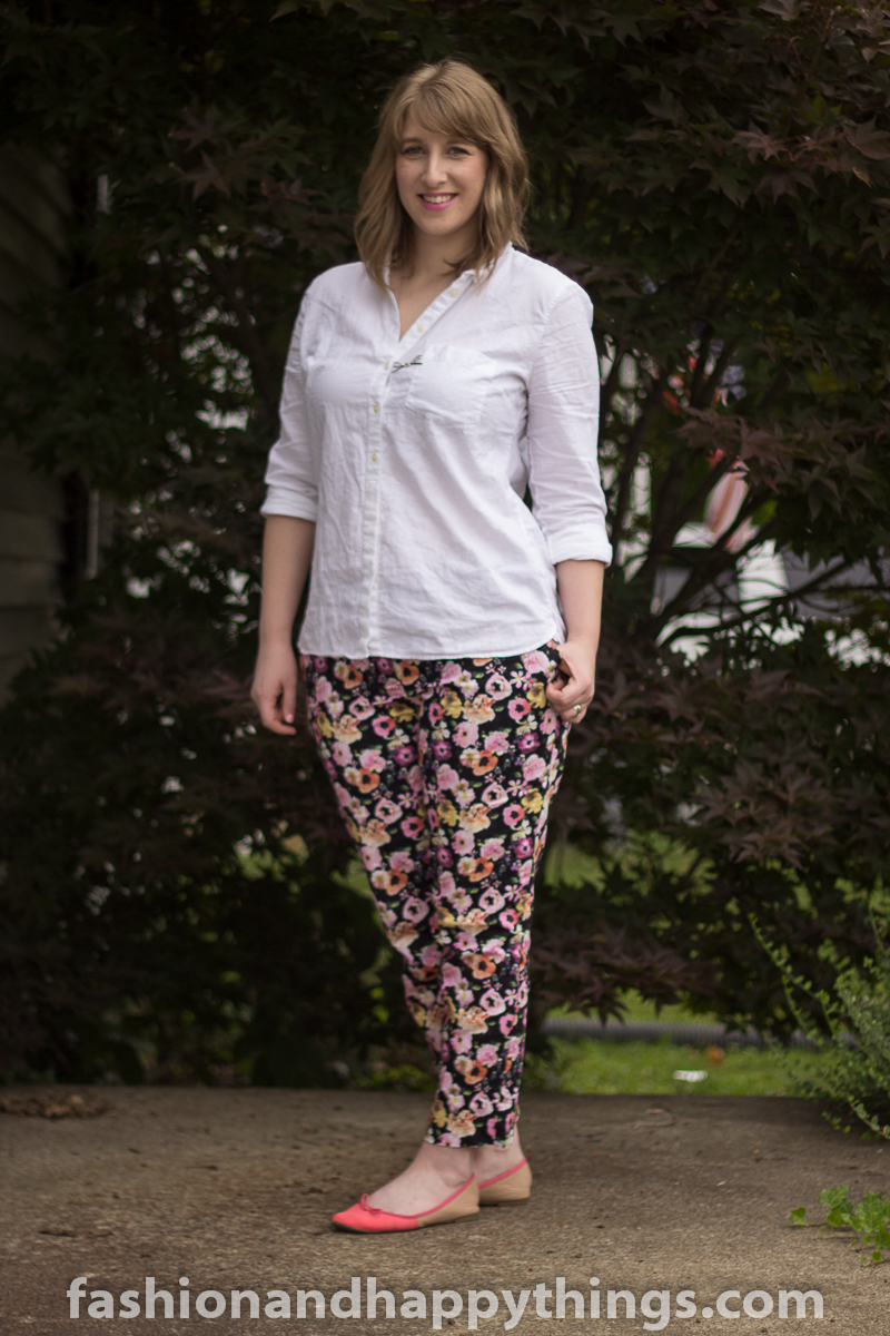 Gap Boyfriend Button Down, H&M Floral Pants, H&M Coral and Tan Flats
