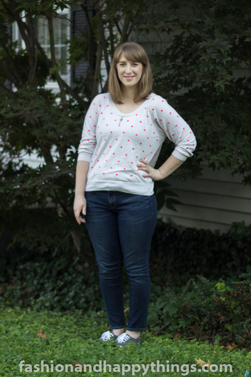 I absolutely love this sweater, its cozy and soft, and has 3 quarter length sleeves. But the best part is that it has Polka Dots. Hot Pink Polka Dots. And so even though it's definitely a lazy day type of top for me, it makes me inexplicably happy to wear it.